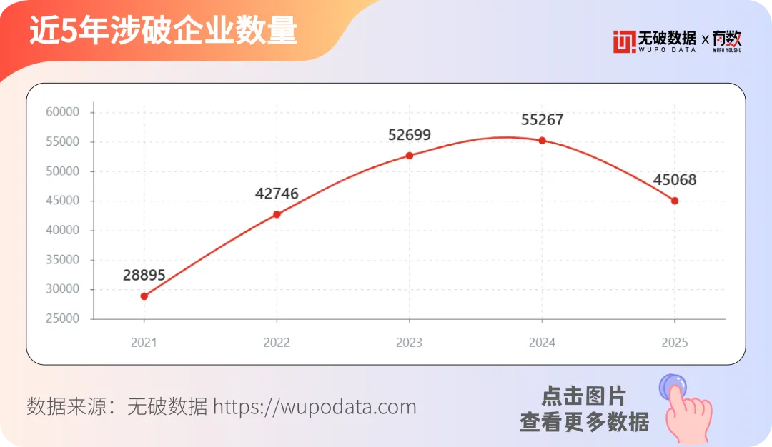 近五年间,涉破企业总量由28895家增长至55267家(2024年)的高峰后轻回落至45068,五年总增长55.9%(复合年均增长率约11.7%),绝对值增加16,173家。