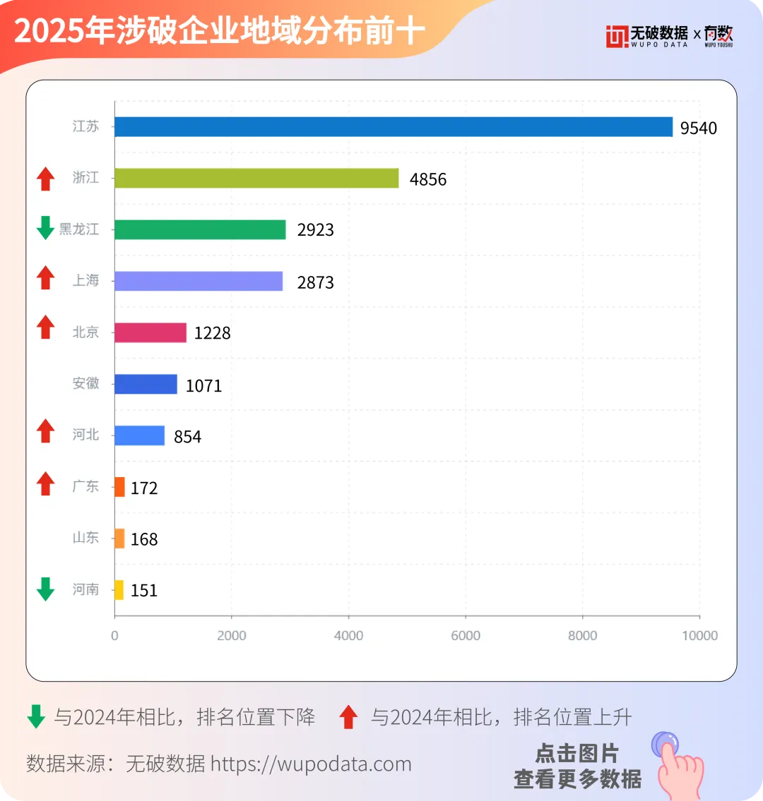 据无破数据显示,2025年涉破企业地域分布高度集中,江苏(9,540家)、浙江(4,856家)、黑龙江(2,923家)位列前三,前十省份合计占比超全国总量72%。