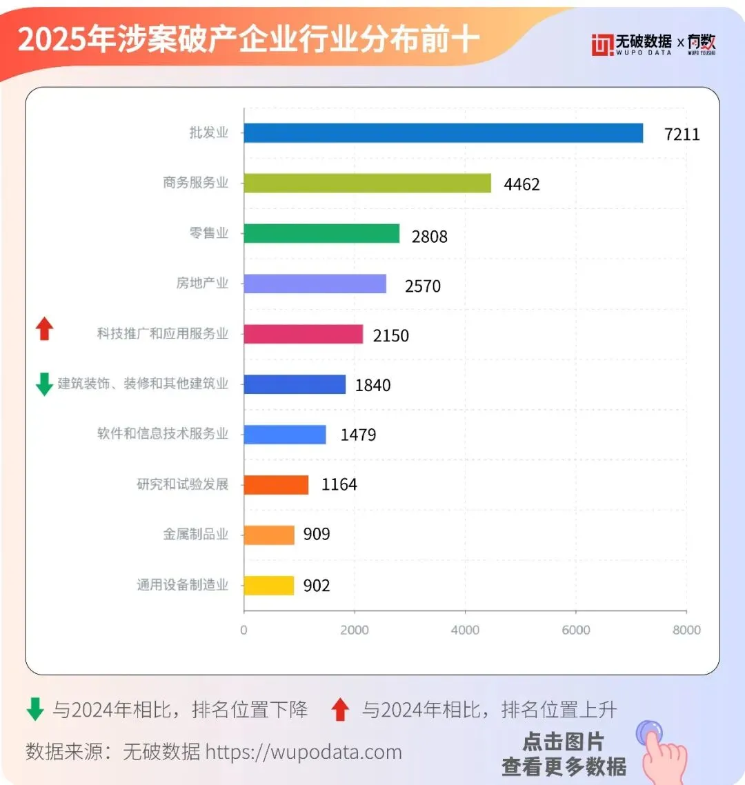 据无破数据显示,在2025年涉案破产企业行业前十中,批发业(7,211家)以28.28%的占比排行第一,商务服务业(4,462家)占比17.5%、零售业(2,808家)占比11.01%分列前三,此三行业的破产企业数量合计占总量的56.79%。