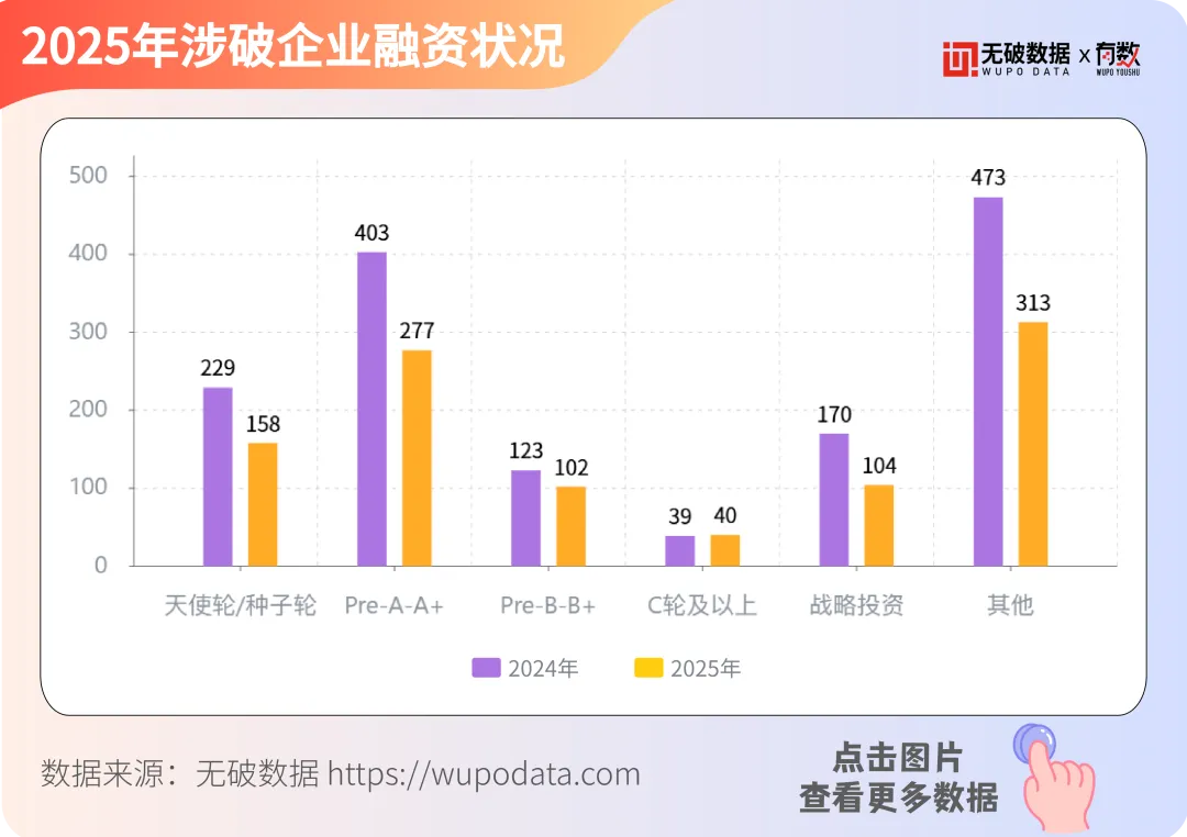 据无破数据显示,2025年涉破企业本身的融资状况如图所示,2025年除“C轮及以上”档位外,2025年每个融资轮次的破产企业数量都低于2024年。
