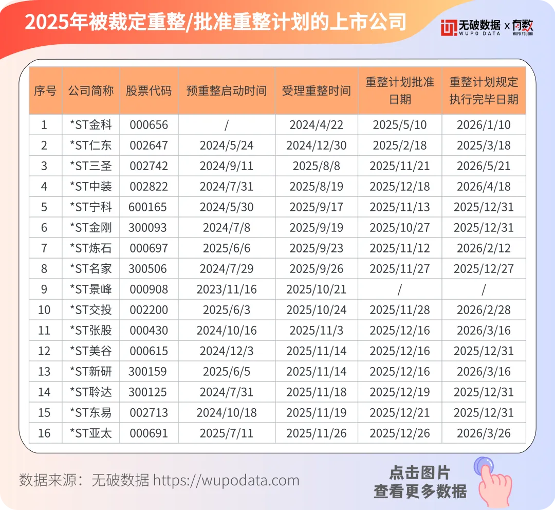2025年共有16家被裁定重整/批准重整计划的上市公司,基本情况详见下表: