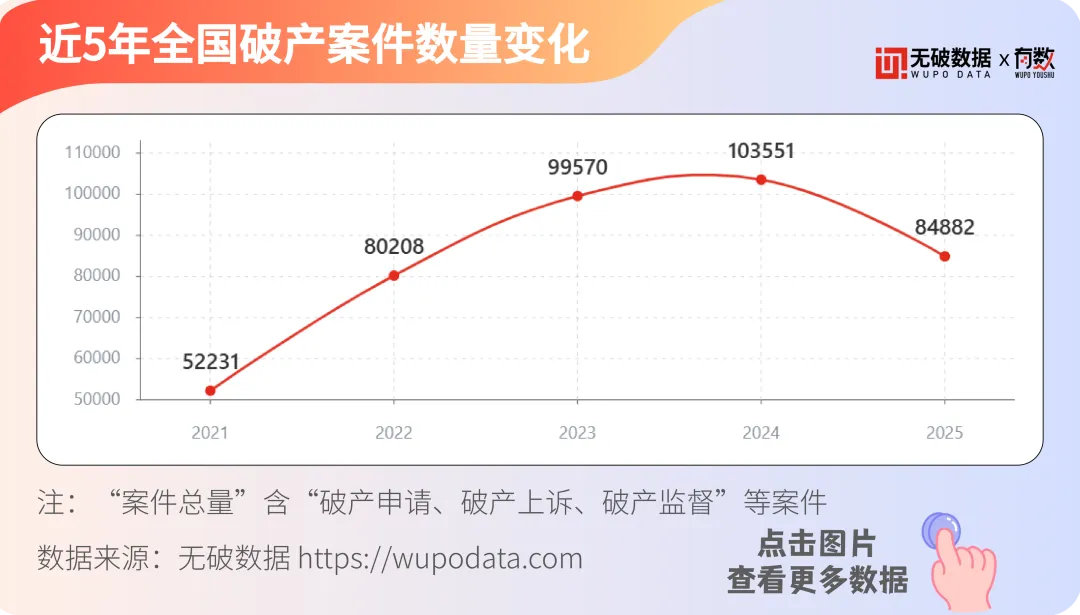 据无破数据显示,近五年全国破产案件总数先升后降。2025年案件数为近五年首次回落,全年破产案件共84882件,环比下降18%,标志着2021-2024“高速扩张期”结束。