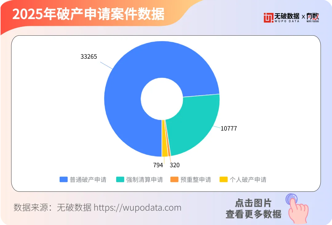 据无破数据显示,2025年破产申请案件数据中,普通破产申请共33,265件,占比约73.67%,其次为强制清算申请10,777件,占比约23.87%,两种类型占比高达97.53%。预重整申请和个人破产申请的占比相对较小。