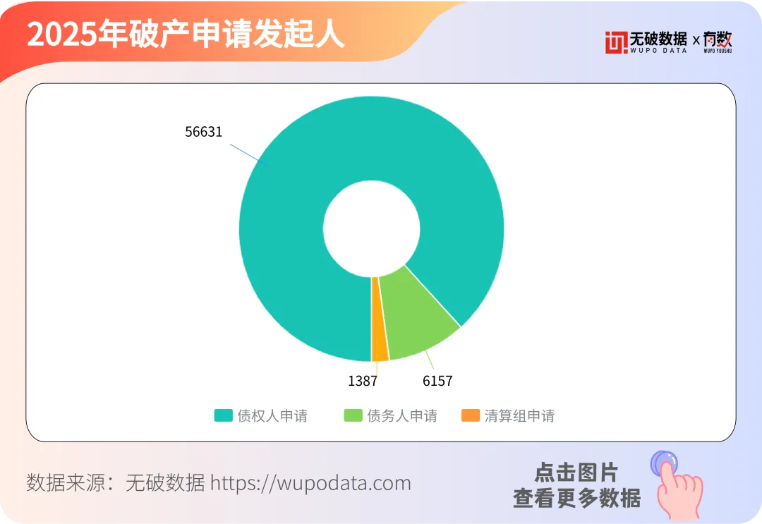 据无破数据显示,2025年破产申请发起人数据中债权人申请占比最大,有56631件,占总数的88.24%;债务人申请有6157件,清算组申请有1387件。这表明在破产申请的发起过程中,债权人起到了主导作用,而债务人和清算组的申请数量相对较少。