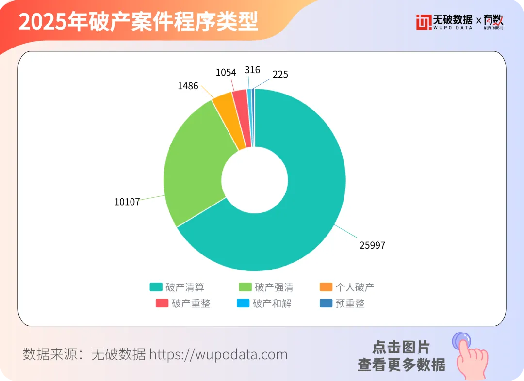 据无破数据显示,2025年破产案件程序类型数据显示,破产清算案件数量最多,共有25997件,占总数的66.34%;破产重整案件有10107件,占比约为25.79%,两者共同占据约92.13%。破产和解案件有1486件,破产强清案件有1054件,个人破产案件有316件,相对较少,预重整案件数量最少,仅有225件,仅占0.57%。