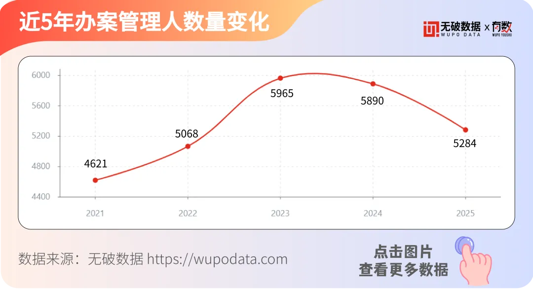据无破数据显示,2021年至2025年,全国办案管理人数量呈现先增后减的趋势。2021年,办案管理人数量为4621(家)个,2022年数量增加至5068(家)个,同比增长约9.7%;2023年,数量进一步增加至5965(家)个,同比增长约17.7%,达到五年内最高点。