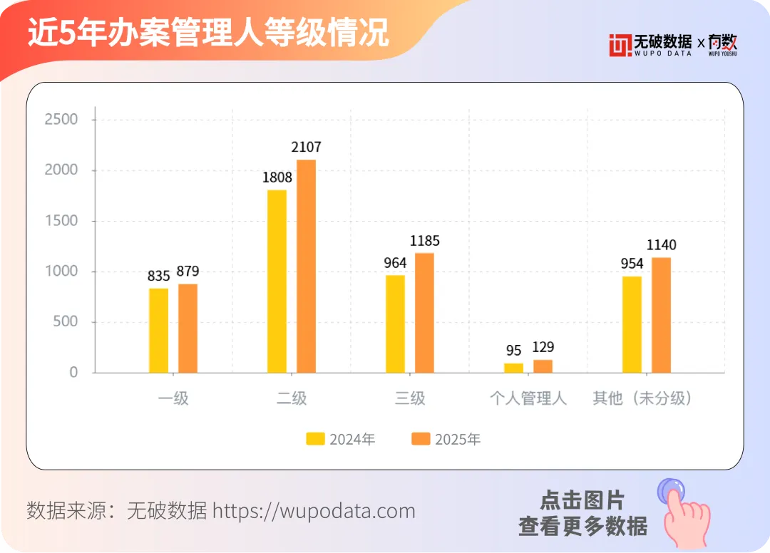 据无破数据显示,较去年相比,不同级别管理人数量均有所增长,不同级别的管理人在数量上有明显差异。近两年管理人级别中,均为二级、三级管理人人数占比最高,2025年,二级、三级管理人在总占比中分别达到38.60%和21.71%,共占比超六成。