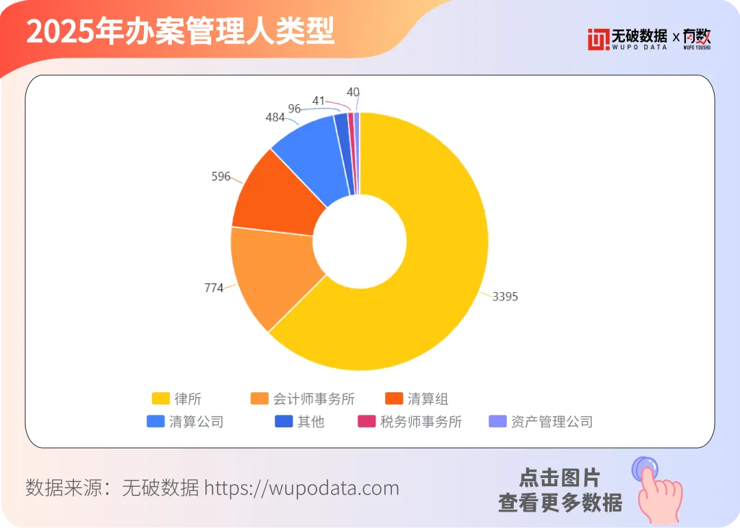 据无破数据显示,2025年参与办案管理人5426家,召开债权人会议21790场。2025年参与办案的管理人类型中,律所是最主要的管理人类型,共有3395家,占比约68.7%。其次是会计师事务所,有774家,占比约15.7%,两者共占超过八成,其他类型的管理人如税务师事务所、资产管理公司等,数量相对较少。