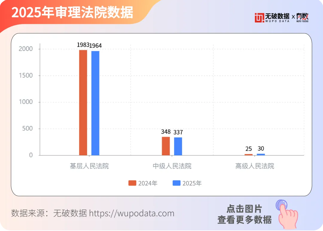 据无破数据显示,近两年,参与审案的法院数量中基层人民法院数量最多,2025年占据总数84.26%,中级人民法院数量次之,2025年占比14.46%,高级人民法院数量最少,2025年仅占比1.29%。