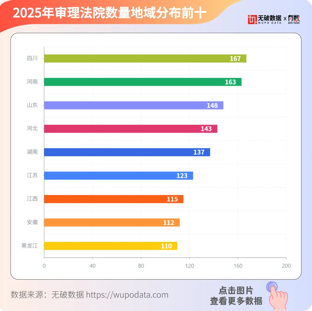 据无破数据显示,2025年审理破产案件的法院数量在四川省有167家,占比前十法院总数中的13.71%,位居第一;河南省有163家法院,占比13.38%,紧随其后。山东省和河北省分别有148家和143家法院,占比分别为12.15%和11.74%。