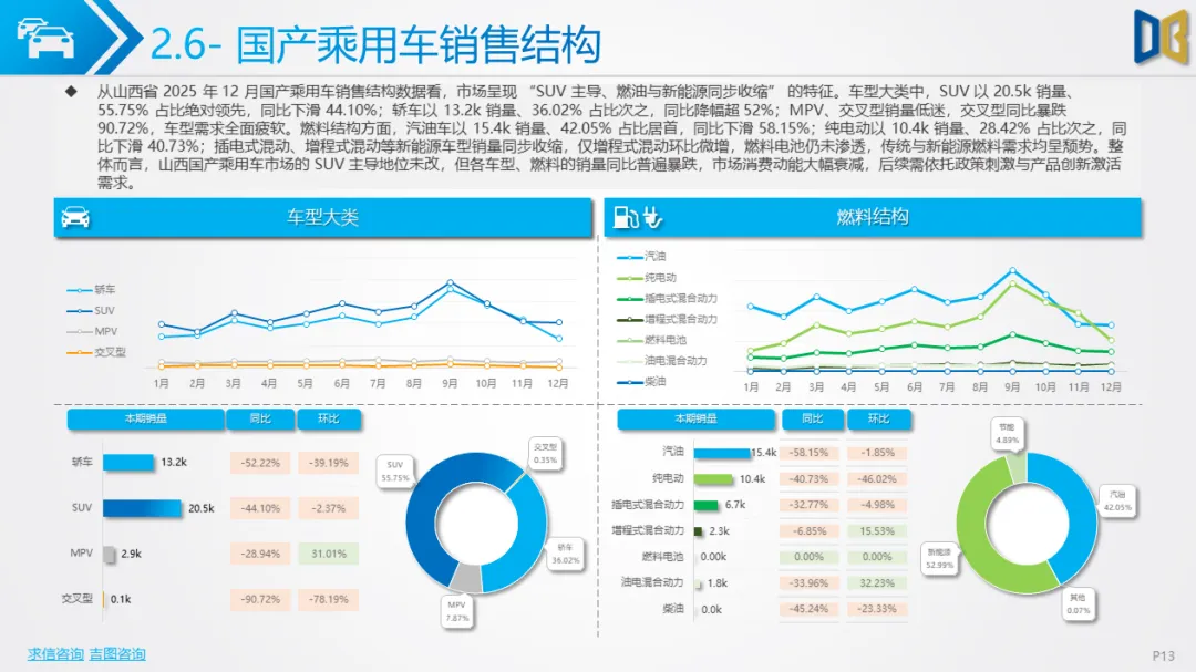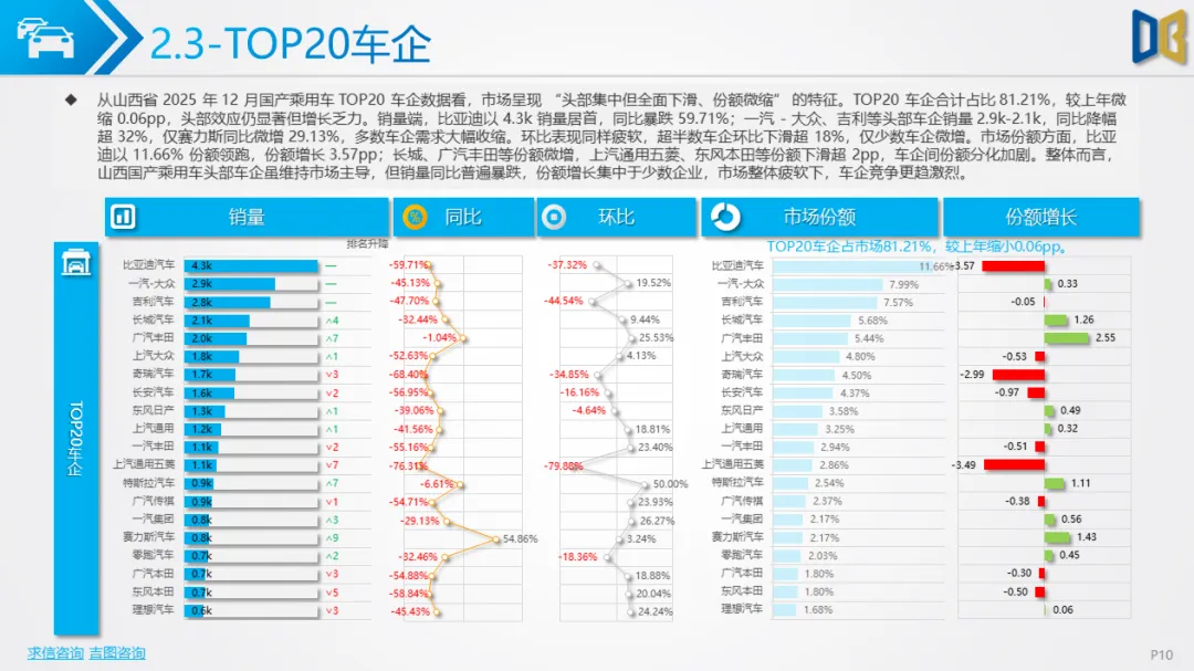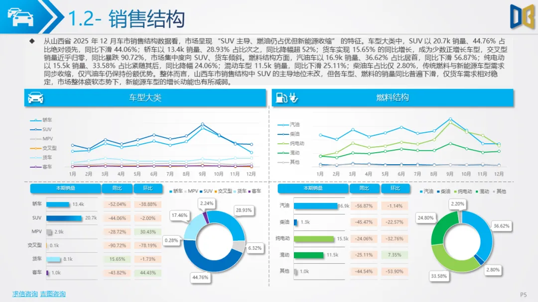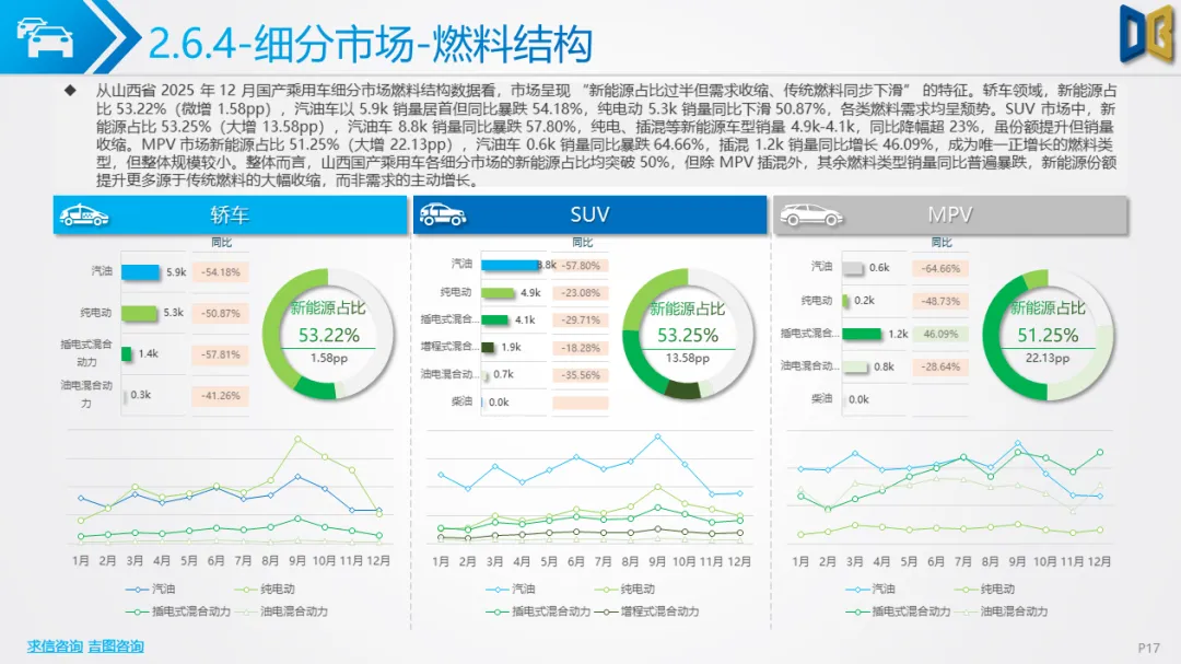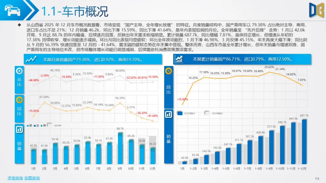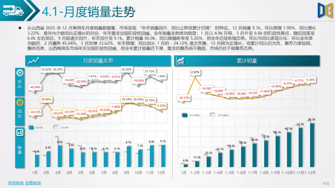 综上,2025年12月山西省汽车市场是 “疲软中的局部回暖”,商用车的新能源转型与刚需支撑暂时对冲了乘用车的全面收缩,但整体市场仍未走出低迷周期,后续需依赖消费刺激政策与产业转型红利,才能实现真正的复苏。