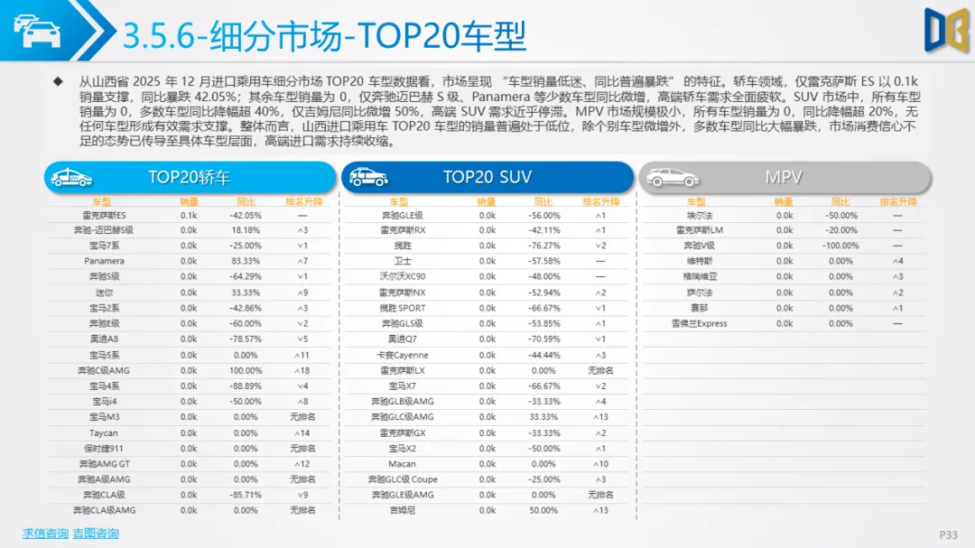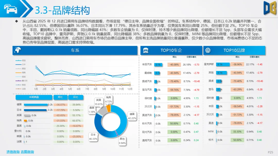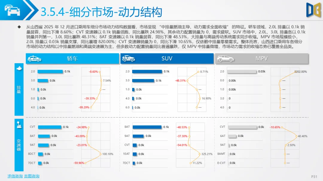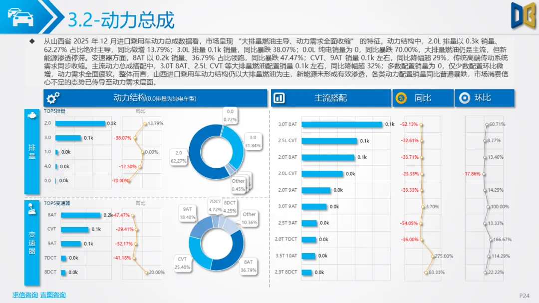 •结构特征:德日品牌合计占比超82%,丰田、奔驰、雷克萨斯等头部品牌销量0.1k左右,但同比降幅普遍超38%;动力结构仍以2.0L/3.0L大排量燃油为主(占比超90%),新能源占比不足3%且无增长;区域上完全依赖太原(占比超75%),其余城市销量为0,市场集中度达历史极值。