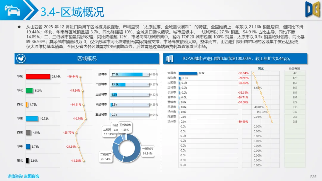 •乘用车领域:进口乘用车、国产乘用车的销量均集中于太原,其余城市(如大同、运城)销量为0;商用车领域太原以1.6k销量居首,大同、运城等城市销量超1.0k,但同比增速分化明显(吕梁增长73.48%,临汾下滑30.55%)。