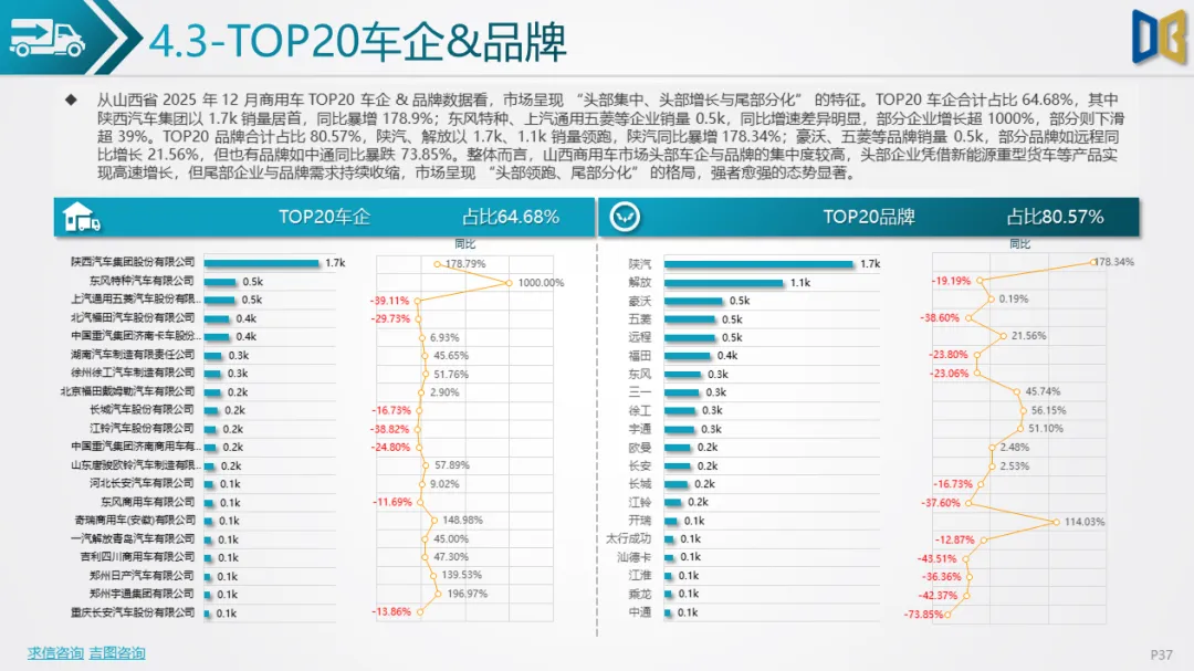12 月山西省商用车市场呈现 “销量回升、结构优化、头部集中” 的特征,成为当月汽车市场唯一的 “亮点板块”。
