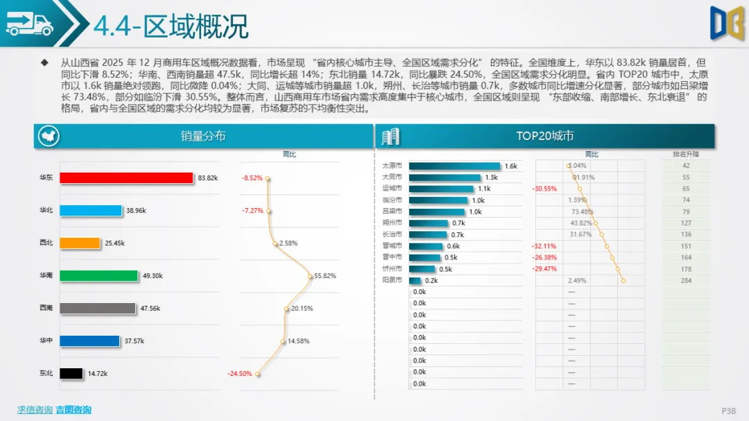 •商用车全国销量分布中,华东以83.82k销量居首,但同比下滑8.52%;华南、西南销量超47.5k,同比增长超14%;东北销量14.72k,同比暴跌24.50%,全国区域呈现 “东部收缩、南部增长、东北衰退” 的格局。