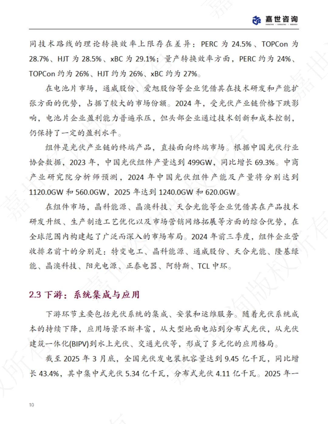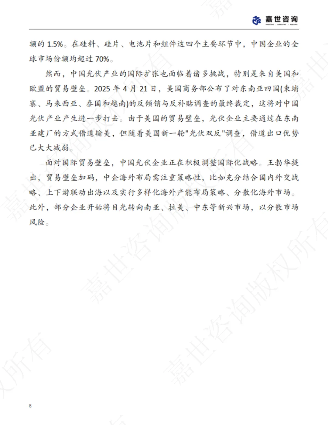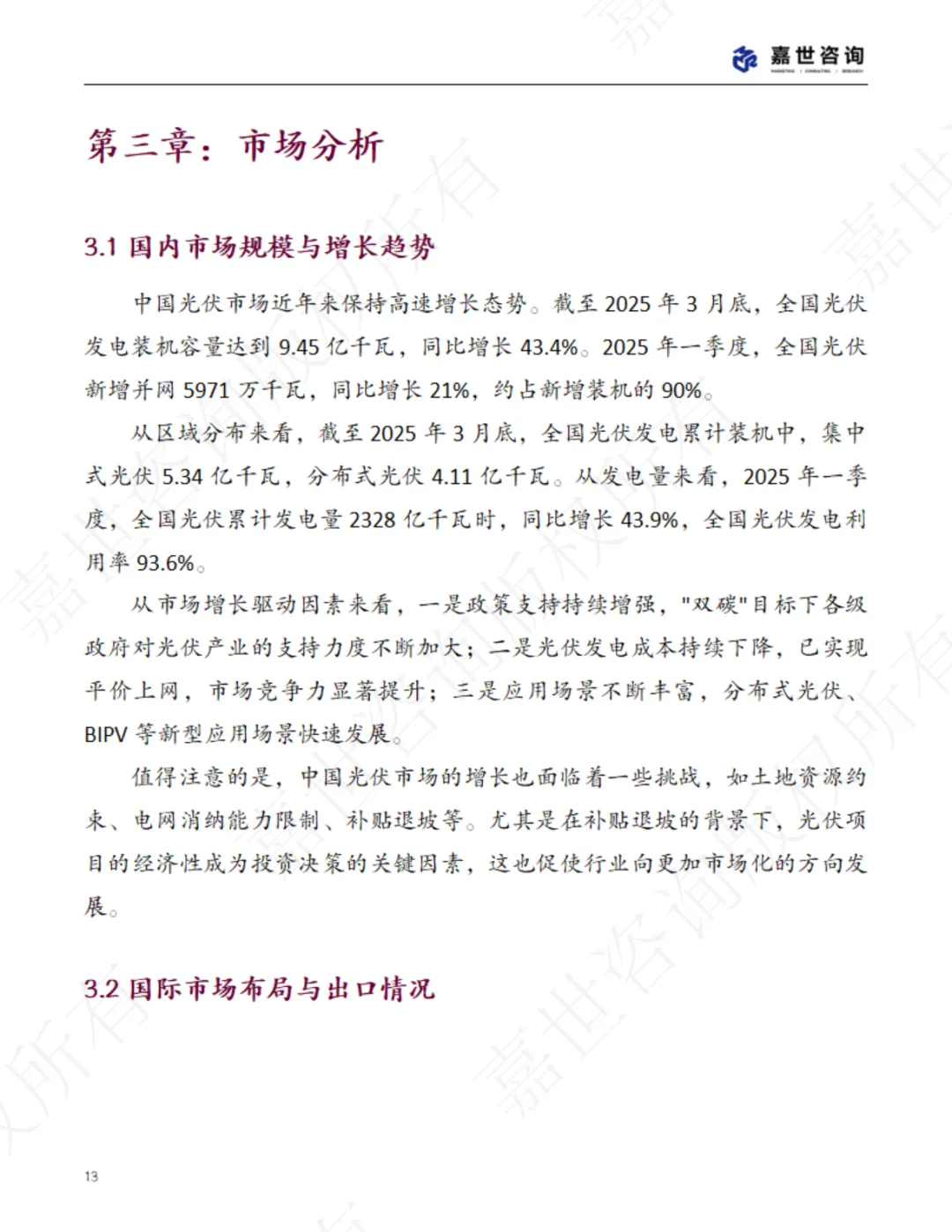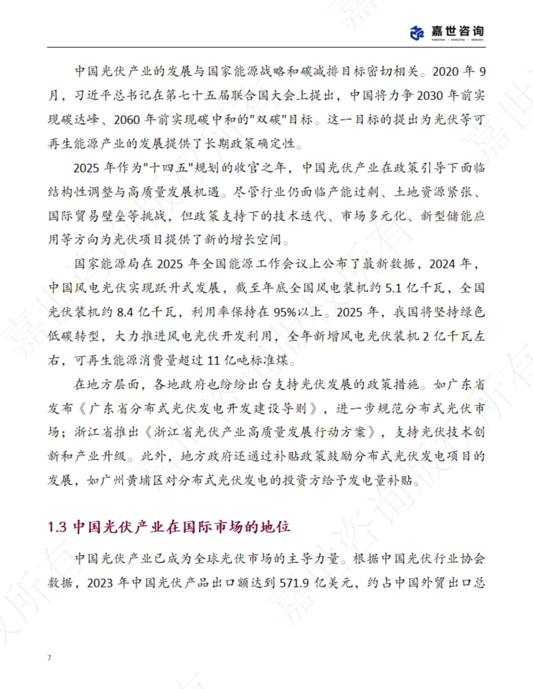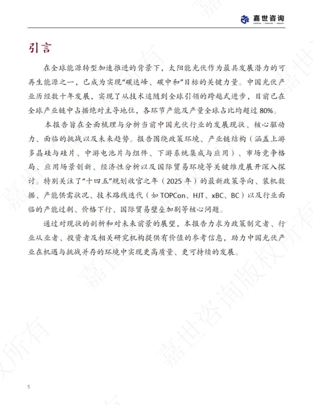 通过对现状的剖析和对未来前景的展望,本报告力求为政策制定者、行 业从业者、投资者及相关研究机构提供有价值的参考信息,助力中国光伏产 业在机遇与挑战并存的环境中实现更高质量、更可持续的发展。