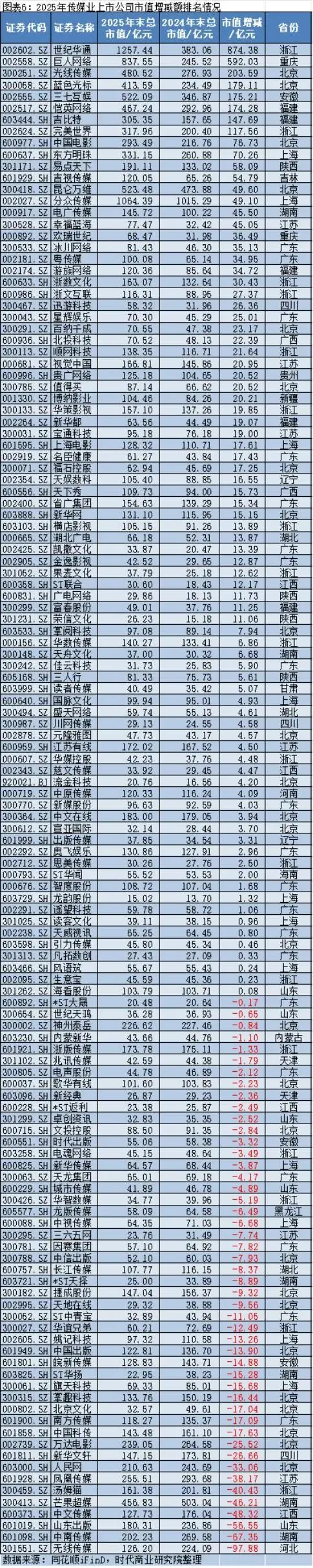 2025年,传媒上市公司市值增加最多的是世纪华通,其2025年年末的市值约为1257.44亿元,较2024年年末的383.06亿元增加约874.38亿元;市值减少最多的是无线传媒(301551.SZ),其2025年年末的市值约为126.20亿元,较2024年年末的224.09亿元减少约97.88亿元。