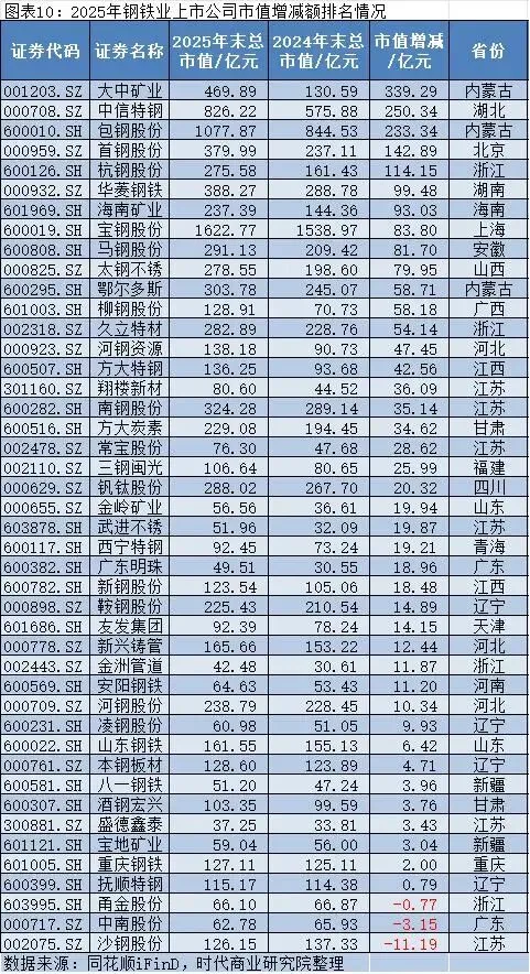 2025年,钢铁上市公司市值增加最多的是大中矿业(001203.SZ),其2025年年末的市值约为469.89亿元,较2024年年末的130.59亿元增加约339.2945亿元,增长了两倍多;市值减少最多的是沙钢股份(002075.SZ),其2025年年末的市值约为126.15亿元,较2024年年末的137.33亿元减少约11.19亿元。