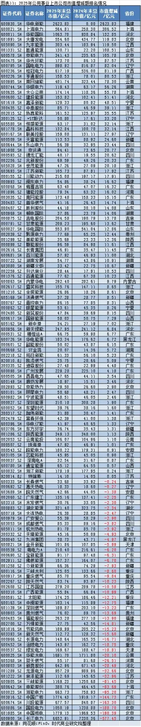 2025年,剔除新股华电新能(600930.SH)后,公用事业上市公司市值增加最多的是上海电力(600021.SH),其2025年年末的市值约为564.81亿元,较2024年年末的258.30亿元增加约306.52亿元;市值减少最多的是长江电力,其2025年年末的市值约为6652.91亿元,较2024年年末的7230.36亿元减少约577.45亿元。