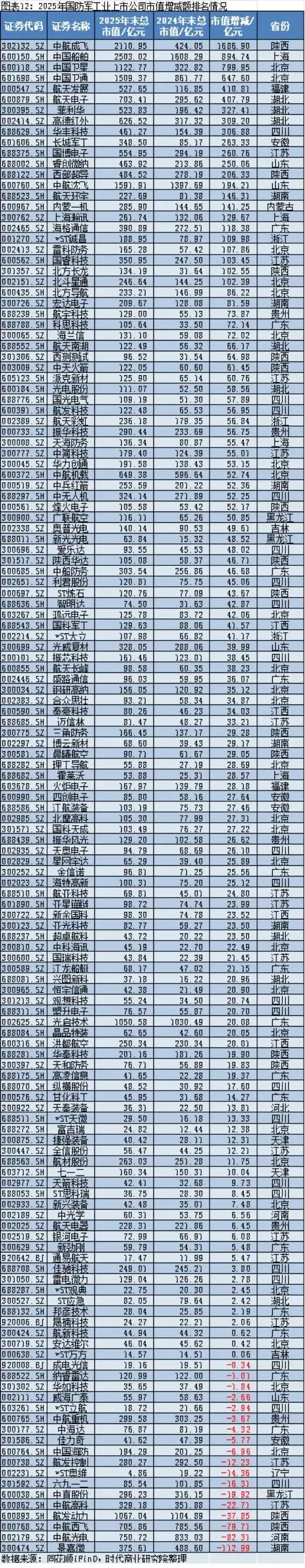 同花顺iFinD数据显示,截至2025年年末,A股市场市值最大的国防军工上市公司是中国船舶(600150.SH),约为2503.02亿元;市值最小的国防军工上市公司是*ST奥维(002231.SZ),约为4.86亿元。
