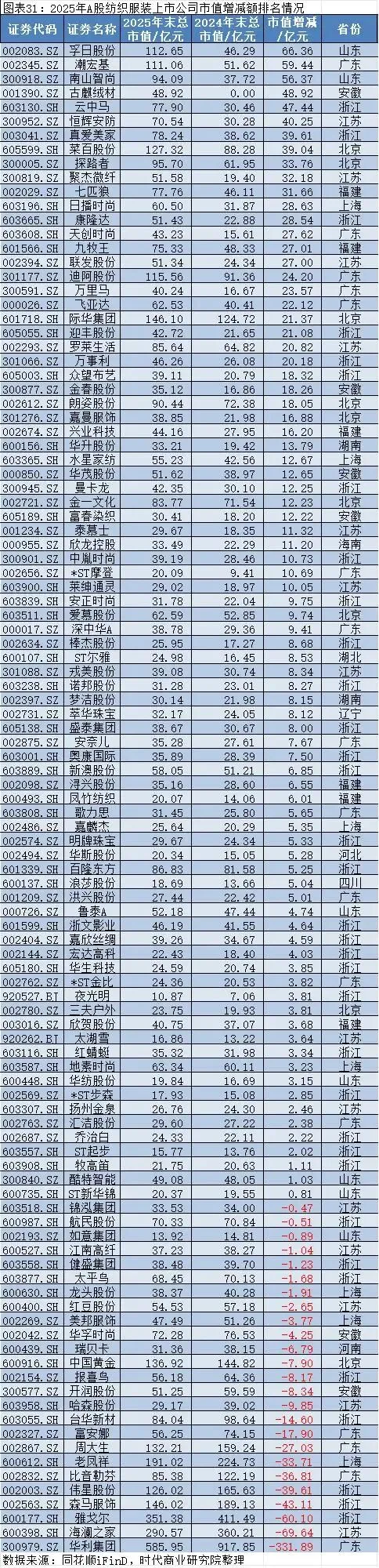 南山智尚(300918.SH)、古麒绒材(001390.SZ)等在新材料领域有所建树的企业市值增长良好,排名第三、第四,凭借功能性面料、高端绒材等技术优势,契合绿色消费与品质消费趋势,获得估值溢价。