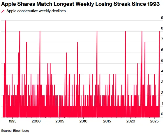 自去年 12 月 2 日触及高点以来,苹果股价已下跌逾 10%,是同期 “科技七巨头” 中表现最差的,也是标普 500 指数点数层面最大的拖累因素。该股已连续八周下跌,上次出现更长的连跌纪录还要追溯到 1993 年。