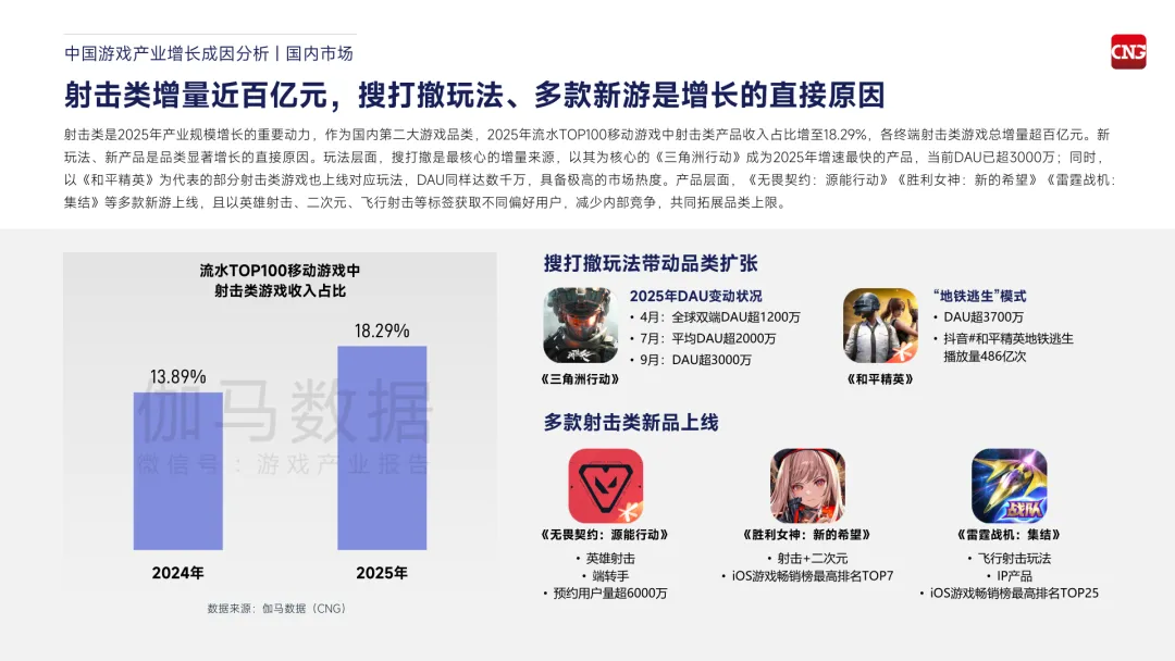 市场规模双高:2025年国内游戏市场收入3507.89亿元,自研出海收入204.55亿美元,均保持快速增长,头部企业与成熟品类为核心驱动力。 品类贡献突出:射击类、小程序游戏为国内市场带来超百亿元增量;策略类(含SLG)、合成类推动出海市场增长超200亿元。 用户需求转变:近6成用户偏好温馨、低压力的游戏氛围,情感性价值需求超越功利性竞争需求,模拟生活类、合作类游戏崛起。