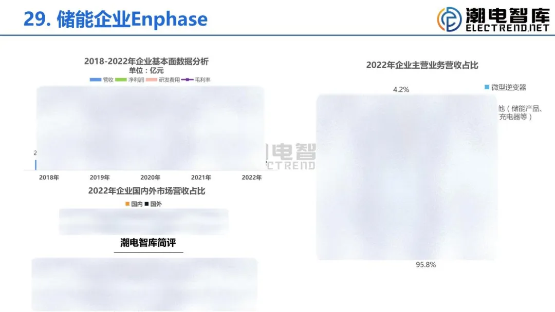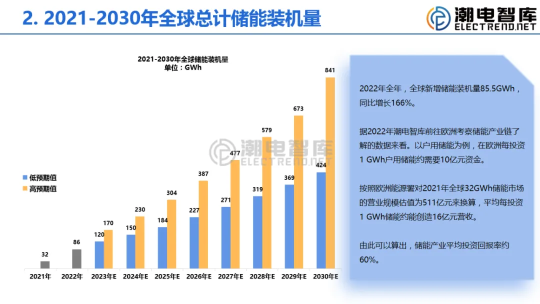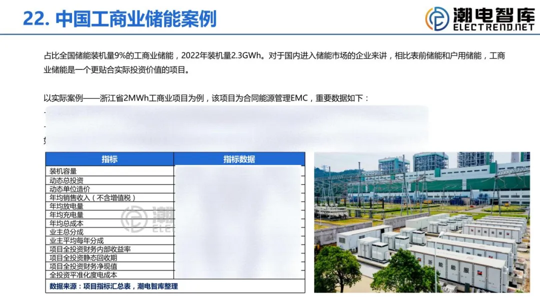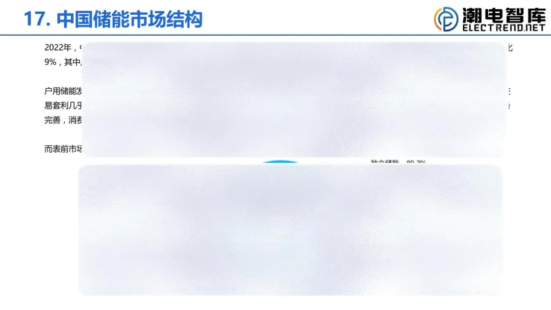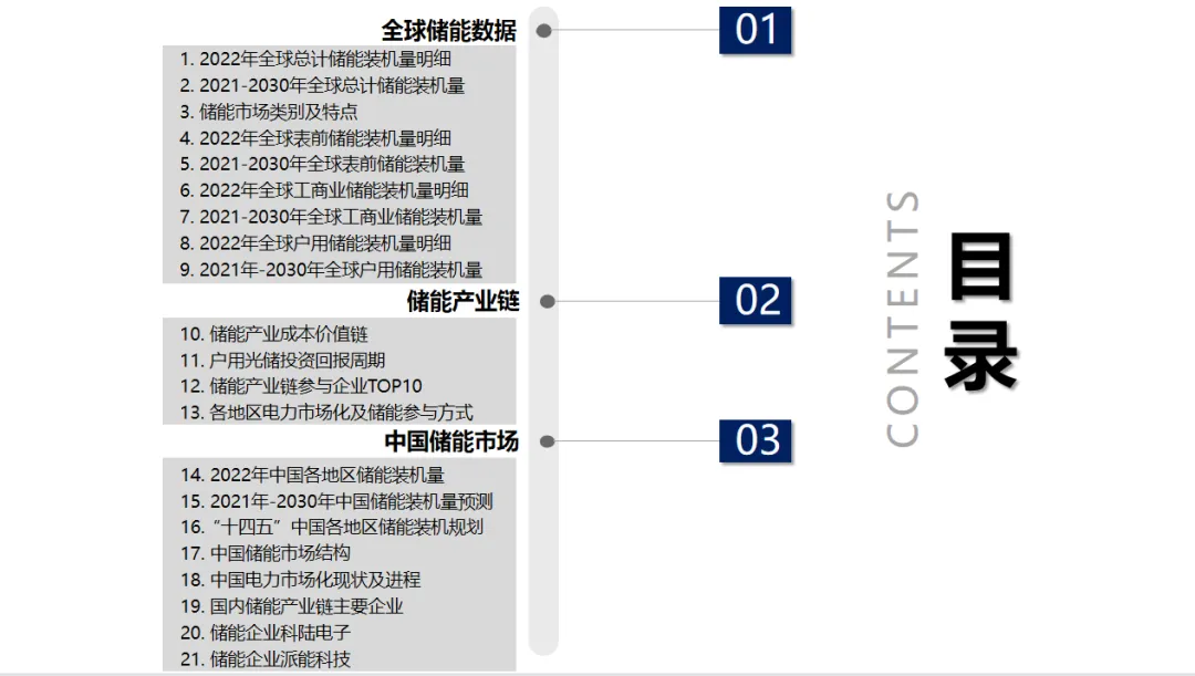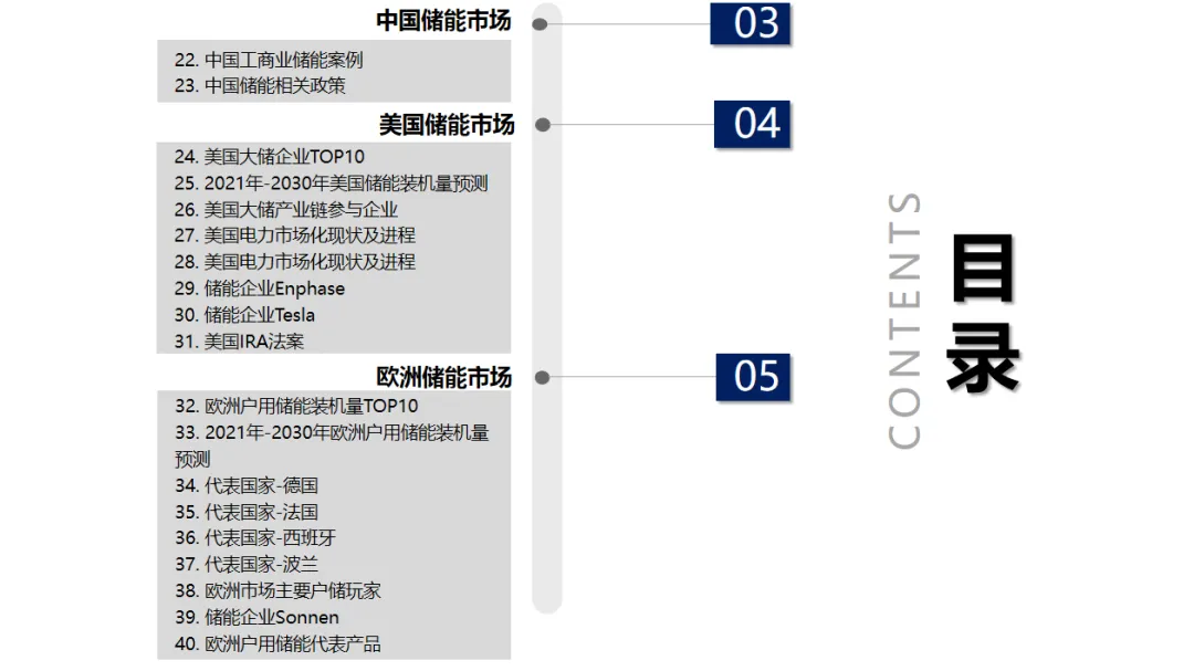 该板块包括2022年全国各省区储能装机量数据、中国储能结构特点、2021-2030年的装机量预测、中国可再生能源发电情况、电力市场化明细、中国储能代表企业详解、中国工商业配储实际案例、近两年最新储能相关政策等。