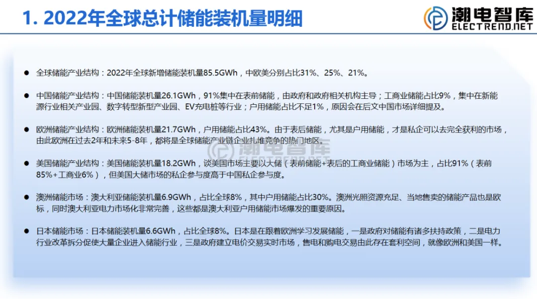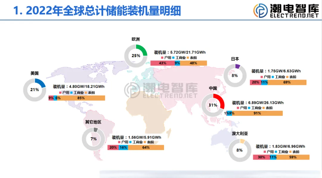 该板块基于2021年和2022年全球五大地区(中国、美国、欧洲、日本、澳洲)和三大市场(表前、工商业、户用)的储能装机量数据,汇总交叉讨论全球各类别储能市场的特点和趋势(2021-2030年)。