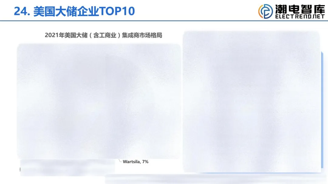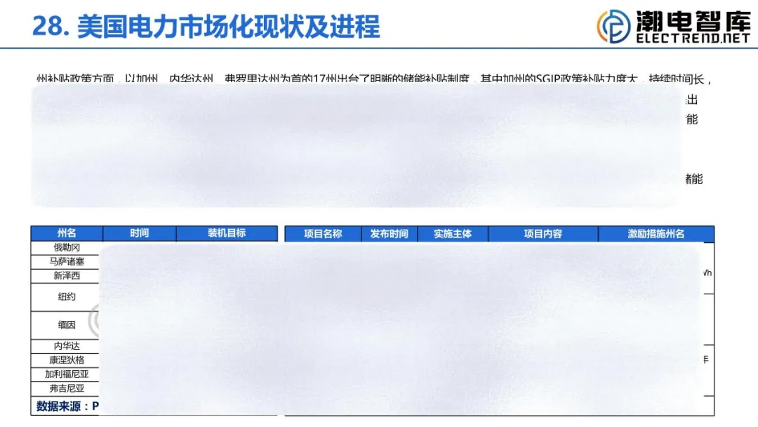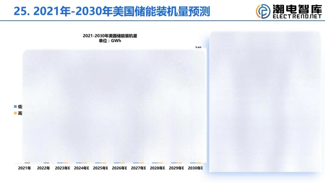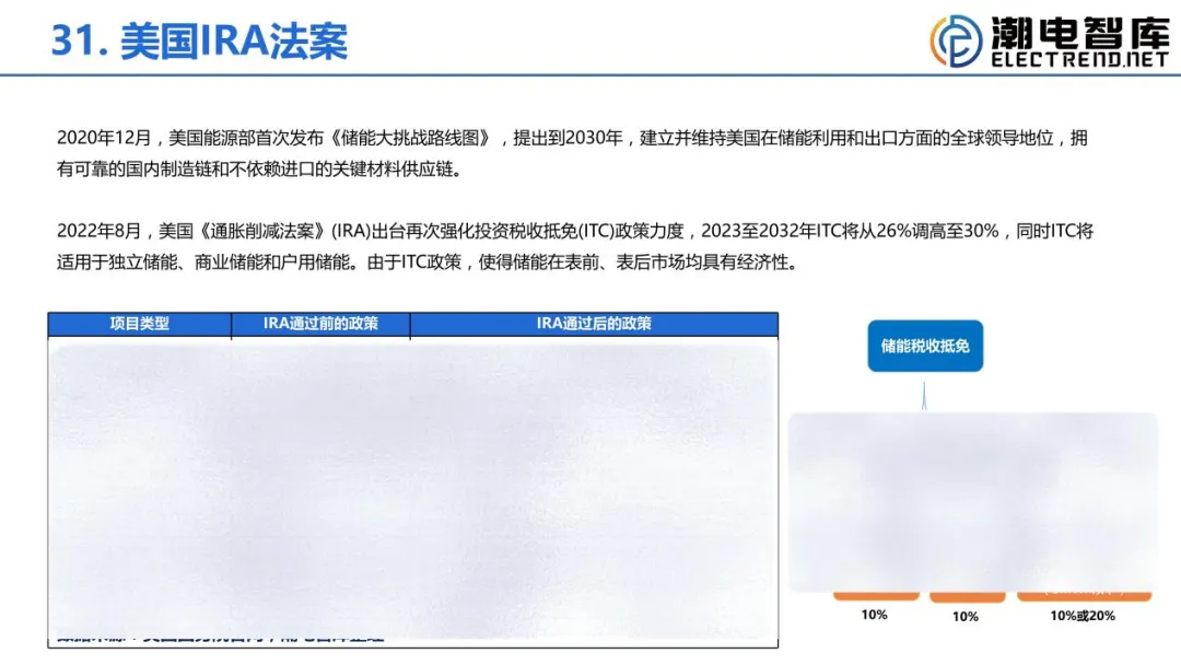 该板块包括2022年美国市场TOP10大储企业、美国各州储能装机量目标、2021-2030年的装机量预测、美国市场储能参与方式及产业链企业、美国可再生能源发电情况、电力市场化明细、储能相关政策、代表企业及产品和重点法案IRA等。