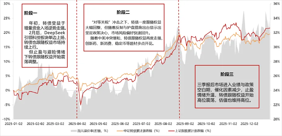 图表1 2025年权益与转债市场主要指数累计涨跌幅与转债市场估值水平(百元溢价率)