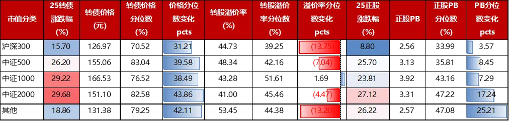 从风格上看,2025年,正股属于中证1000与中证2000的小盘转债表现最强,平均涨幅均达到29%以上,这一方面受正股强势拉动,另一方面也因小盘转债初期转股溢价率偏低,转债跟涨动能较强。其中,中证1000转债价格涨幅明显领跑正股,推升转股溢价率,中证2000转债估值压降幅度不大。2025年,正股属于沪深300的大盘转债与不属于重要指数的微盘转债整体表现相对靠后,其中大盘转债上行动力受制于正股上涨动能偏弱,微盘转债虽然正股涨超26%,但因其前期估值偏高,转债跟涨动能较弱。