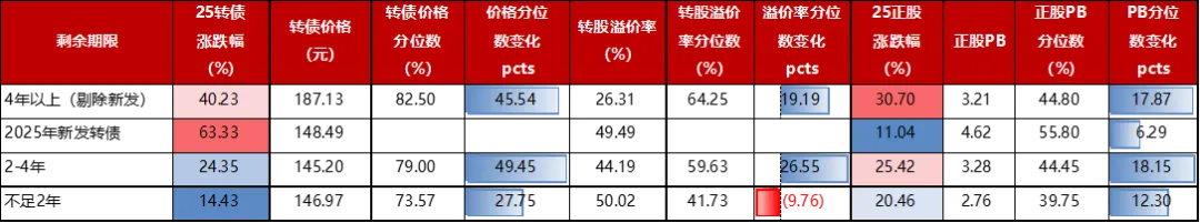 2、2025年,新券及次新券(剩余期限4年以上)由于正股看涨期权弹性充分,平均涨超40%,跑赢正股10pcts;剩余期限不足2年的老龄转债受制于正股表现偏弱和估值压降,平均涨幅不足15%。