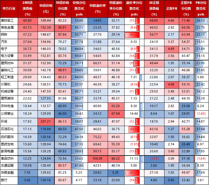 2025年,存续转债超过3支的行业转债均实现收涨,但涨幅出现较大分化,正股拉动成为核心驱动。其中,国防军工、有色金属、钢铁、电子、电力设备、建筑材料、基础化工等行业,2025年转债价格平均涨幅超过30%,同期上述行业正股平均涨幅都在30%以上,年末正股PB 2020年以来的历史分位数较上年末提高超过15pcts,且由于转债跟涨幅度不及正股,上述行业转债估值出现明显压降,年末转股溢价率分位数较上年末下降约10pcts及以上。此外,汽车行业虽然正股涨幅居中,但因转债年初估值较低,跟涨较快,2025年转债平均涨幅也达到37.04%的较高水平。