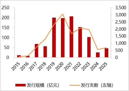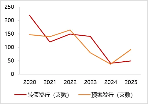 2025年,可转债累计发行50支,较上年增加9支,同比增长21.95%,累计发行规模648.63亿元,同比增长21.95%。不过,2025年转债总体发行规模仍未回到2023年一半水平,也不足2019-2021年发行高峰的四分之一,市场弱发行态势延续。我们认为,这一方面源于2025年监管审核节奏虽边际提速,但月度过审数量依然较少,新发转债数量增长明显弱于预案增长;另一方面,2025年伴随再融资提速,获监管层大力支持的定向增发呈现爆发式增长,对可转债融资形成明显替代,全年A股市场完成增发的企业有157家,累计融资额8281.48亿元,同比激增300.75%。