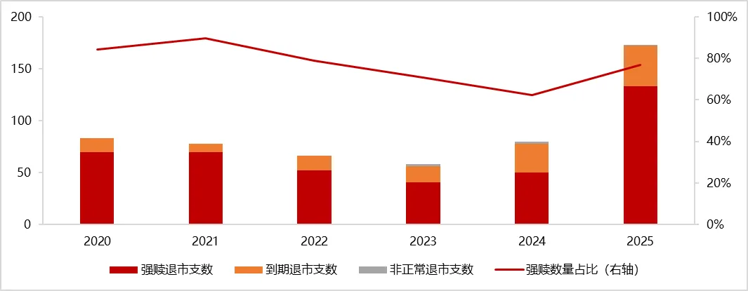 2025年,到期与强赎规模大增令转债退市节奏显著加快。2025年,全市场退市转债173支,规模2126.22亿元,同比分别增长116.25%、99.37%,均创下近年新高。具体来看,2025年到期退市转债数量39支,同比增长39.29%,由于浦发转债、中信转债两只大额银行转债到期,年内累计到期退市规模762.07亿元,同比增长98.97%。同时,2025年权益市场强势运行带动转债强赎触发频率显著增加,年内强赎退市转债数量共133支,同比增长165.96%,规模1355.65亿元,同比增长116.73%。此外,2025年普利转债因发行人财务造假也跟随正股非正常退市。在到期和强赎退市压力下,截至2025年末,转债市场存量规模由2024年末的7337.32亿元降至5571.84亿元,同比减少1765.48亿元,降幅达24.06%,较2024年缩量幅度(1414.45亿元)有所加剧。