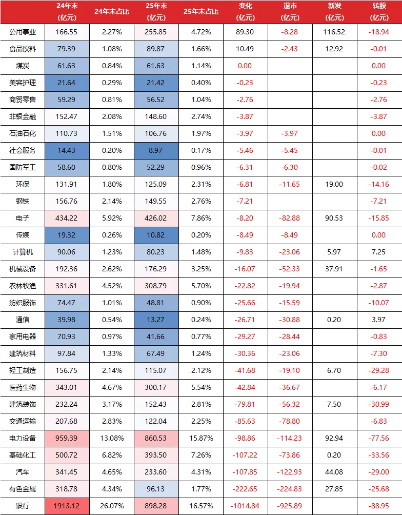 一方面,银行转债缩量逾千亿和转债发行节奏偏缓令优质底仓券缺口依然较大。2025年,仅公用事业行业因新发福能转债、广核转债、太能转债等大额转债,存量规模明显增长,而长期作为优质底仓券配置的银行转债则因大量到期或强赎退市,存量规模缩减1014.84亿元,同比降幅达53.05%,交通运输、汽车、有色金属等行业的优质底仓类转债也出现较大规模缩量。截至2025年末,余额20亿元以上的底仓券已下降至59支,存量规模已降至3237.8亿元,同比分别下降18.06%、27.29%。如果考虑4%及以上的股息率,大额红利转债仅余9支,存量规模825.58亿元,降幅约40%。展望2026年,金融机构核心资本补充压力依然较大,预计定向增发对转债的替代作用仍将延续,银行等金融机构及优质上市公司可能继续优先选择定向增发进行再融资,优质底仓券的新增供给料将有限。