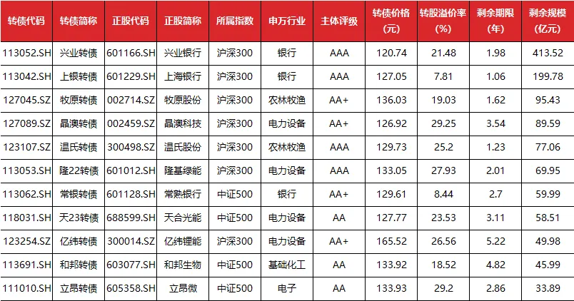 图表22 25年末剩余规模30亿元以上,剩余期限1年以上,转股溢价率30%以下的中大盘转债情况