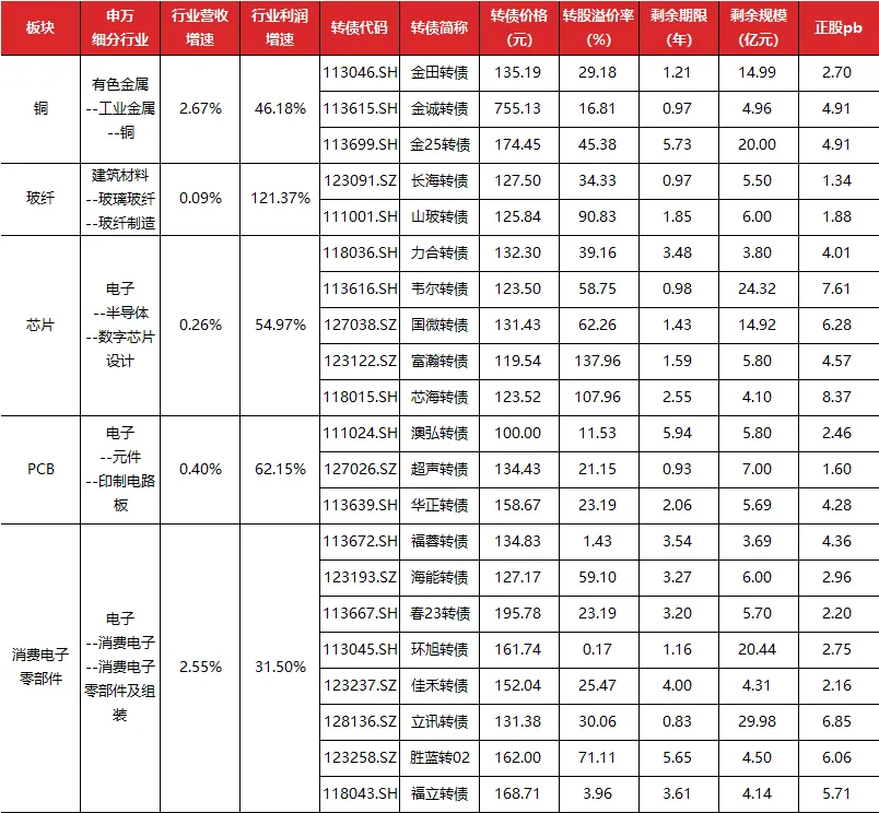 2025年AI算力建设爆发式增长,对诸多细分行业形成明显带动,预计2026年铜、玻纤、电子行业转债将持续受益。2025年前三季度,算力数据中心建设快速放大铜、玻纤两种上游原材料需求,相关上市公司合计利润分别实现46.18%、121.37%的大幅增长,预计2026年行业景气度仍将维持高位,对相应转债构成利好。同时,AI产业热潮带动电子行业众多细分赛道业绩爆发,其中芯片设计、PCB、消费电子零部件板块2025年前三季度利润增速分别达到54.97%、62.15%、31.5%。随着算力芯片出货量保持高增,AI终端消费环节有望迎来爆发,2026年芯片、PCB、消费电子等细分领域业绩高增确定性较强,预计相关转债价格也将有更强支撑。