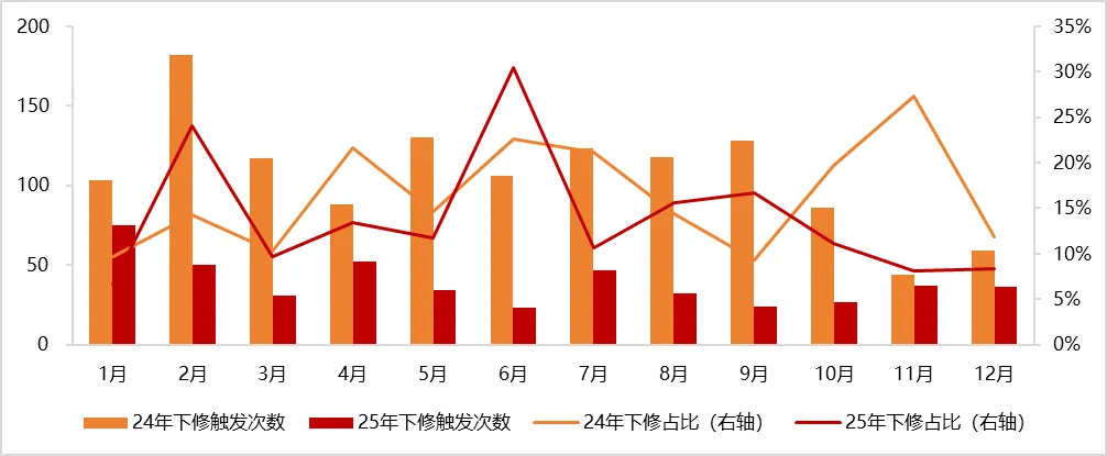 图表30 2024、2025年月度转债触发下修数量与下修占比