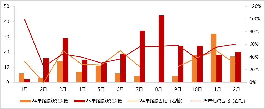 图表31 2024、2025年月度转债触发强赎数量与强赎占比