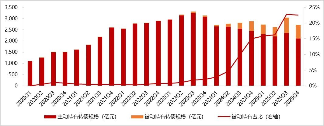 从供给结构看,当前转债价格与估值均已升至高位,考虑到2026年转债存量规模继续萎缩,优质底仓券和新券稀缺性突出,预计转债择券难度将持续提升,其中险资、企业年金、社保基金等绝对收益型机构直接持有转债规模或进一步缩减,更多资金将转为通过基金间接持有,转债市场被动投资占比、基金转债持仓占比有望续创新高。