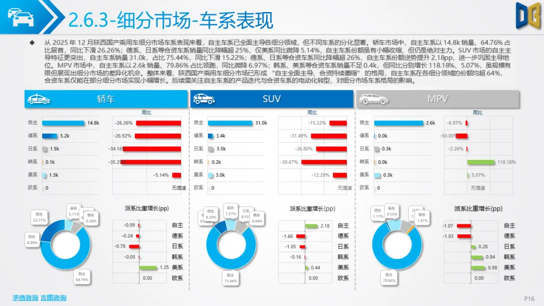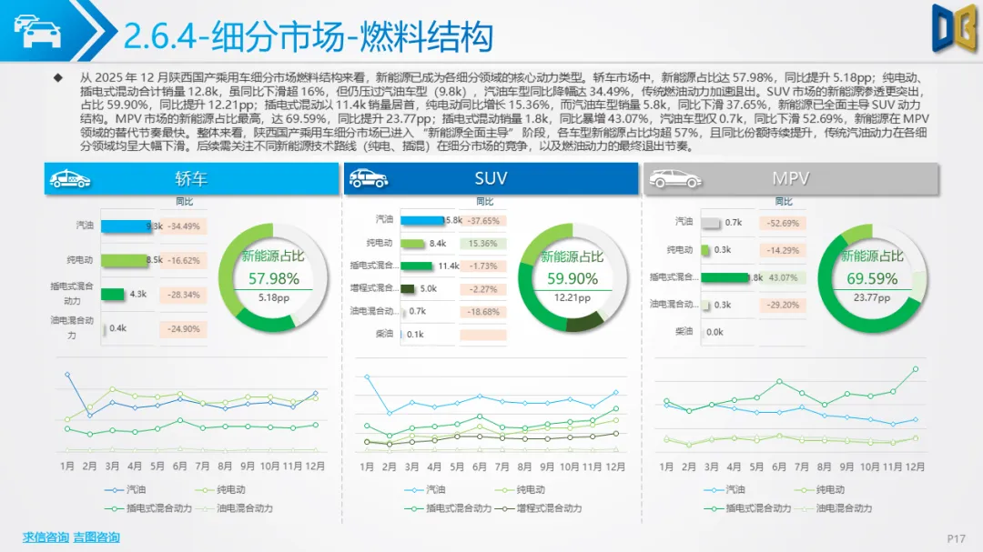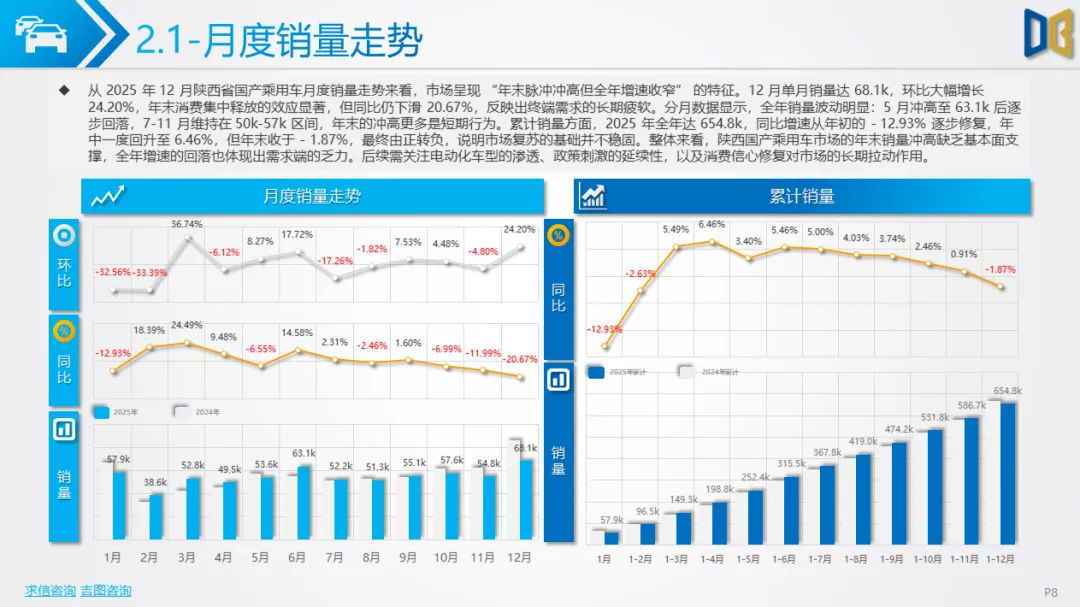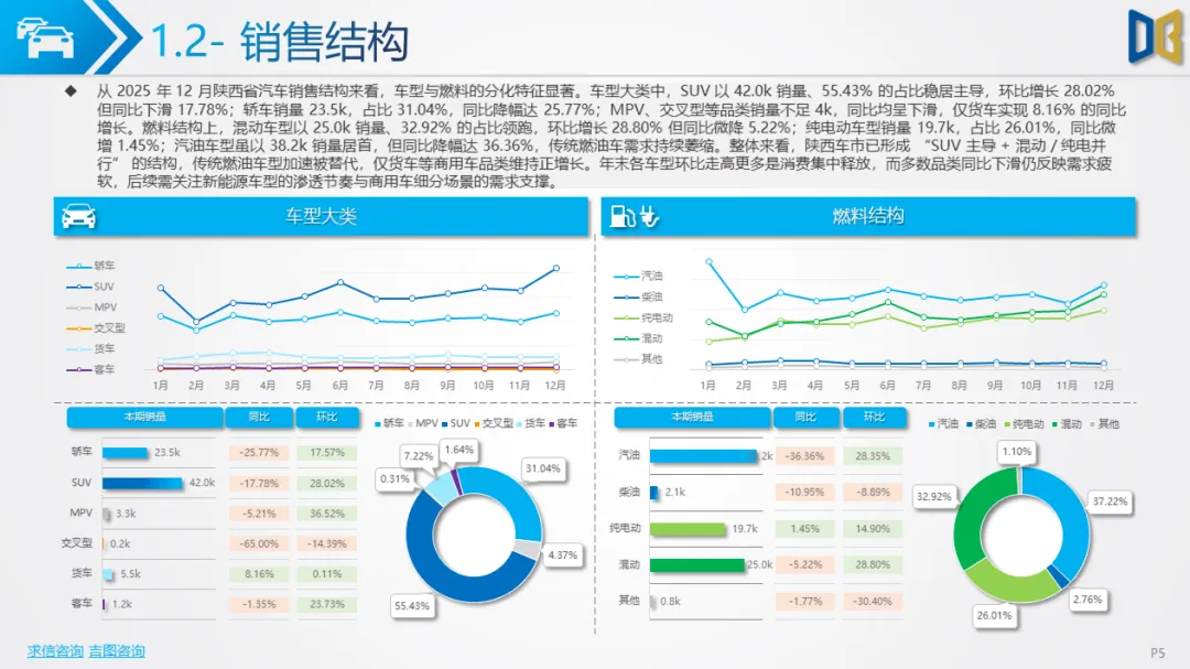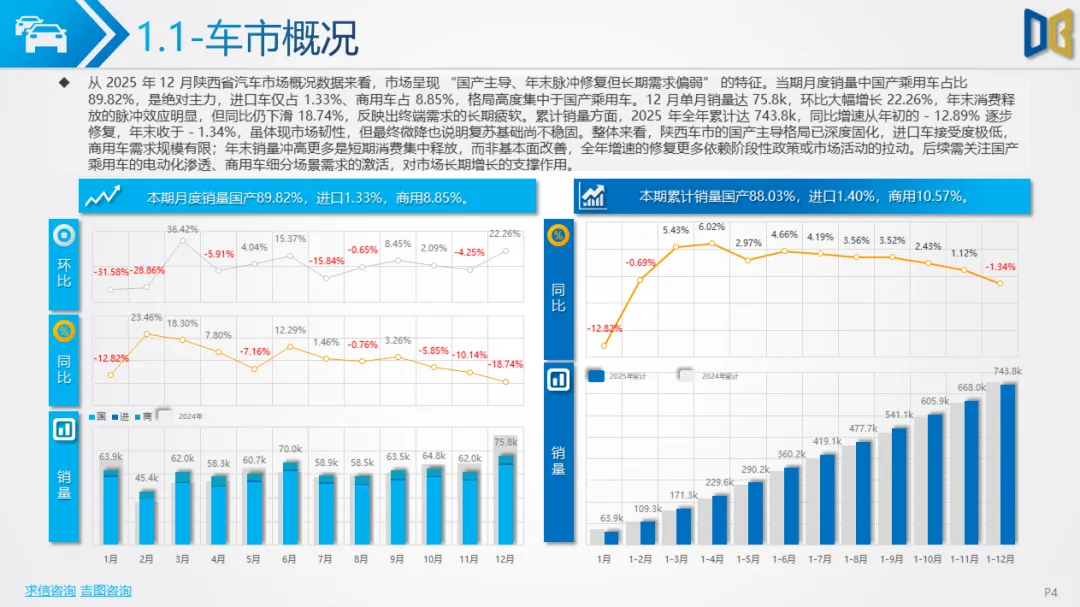 2025年12月陕西省汽车市场呈现 “国产主导、结构分化、新能源引领、区域集中” 的核心特征,年末虽有消费脉冲释放,但长期需求疲软的基本面未改,各细分市场表现差异显著,行业正处于转型与调整的关键阶段。