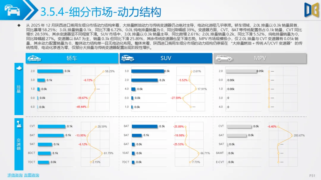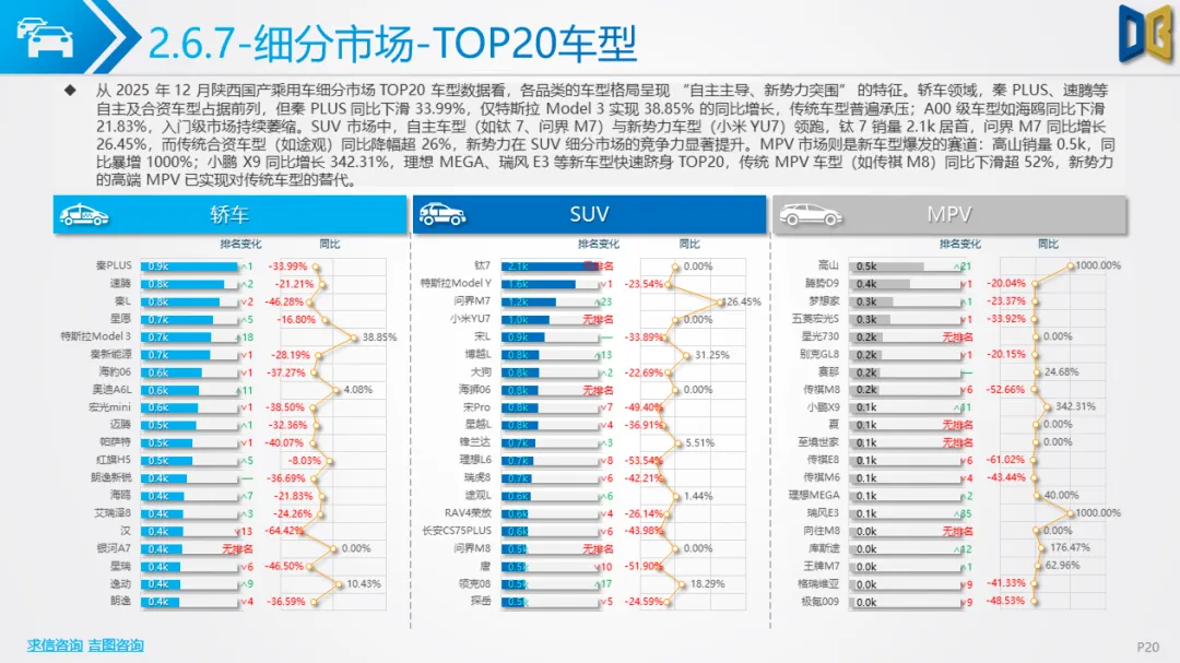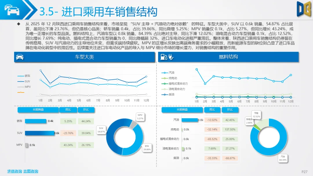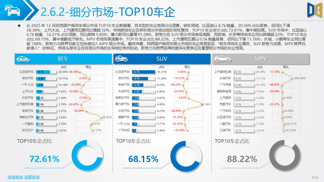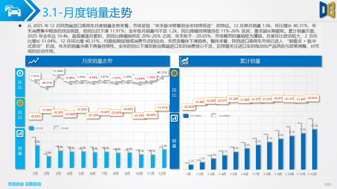 2025年12月陕西省汽车市场呈现 “国产主导、结构分化、新能源引领、区域集中” 的核心特征,年末虽有消费脉冲释放,但长期需求疲软的基本面未改,各细分市场表现差异显著,行业正处于转型与调整的关键阶段。