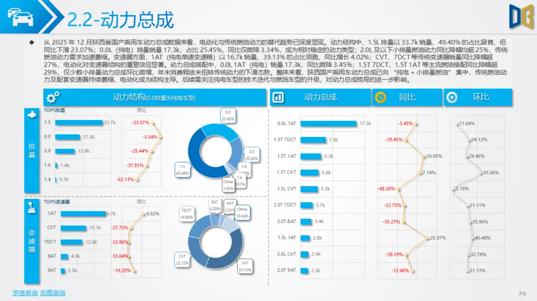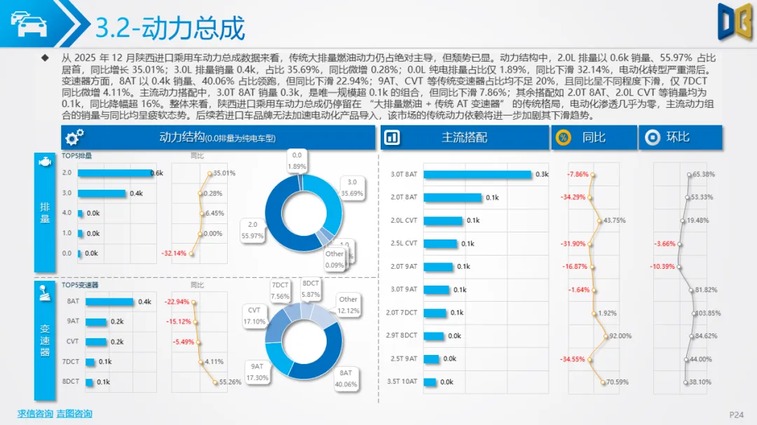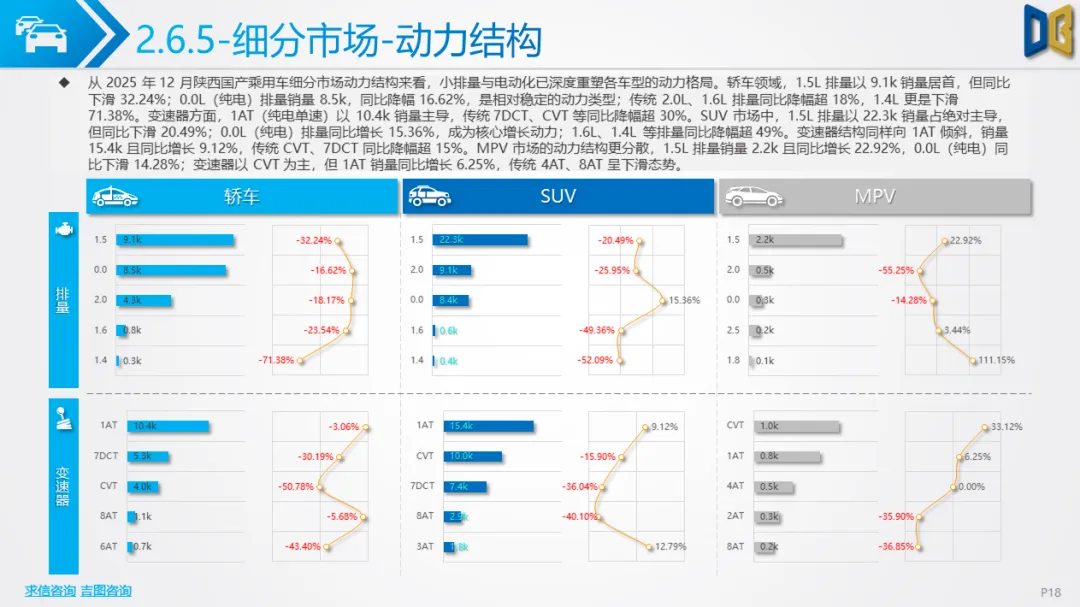 动力总成向 “纯电 +小排量燃油” 集中,0.0L(纯电)排量占比25.45%,1AT变速器同比增长4.02%,传统燃油动力及变速器持续萎缩。