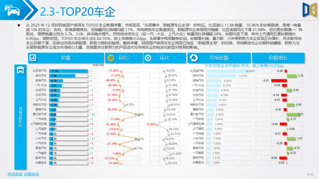 车企格局完成 “新能源主导” 切换,比亚迪以 16.96% 份额居首,特斯拉、理想等新能源车企排名提升,传统合资车企销量同比降幅超28%。