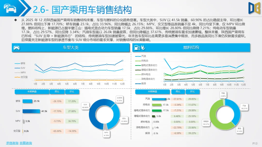 国产乘用车电动化渗透持续加深,传统燃油车加速退出,“SUV + 新能源” 成为市场主流配置。