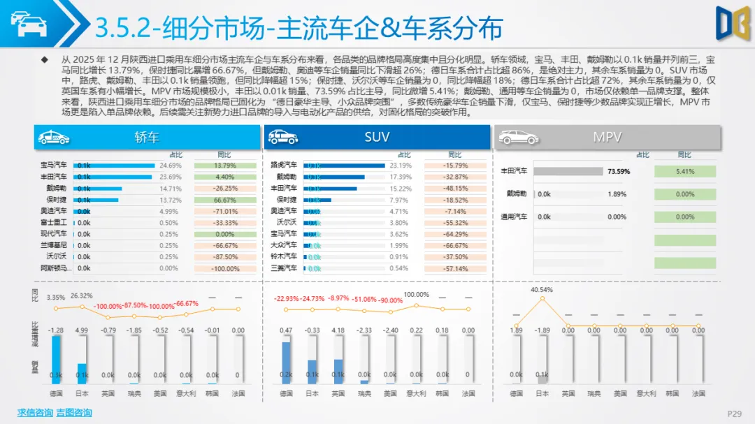 品牌格局以德日主导,合计占比超82%,多数豪华品牌销量下滑,仅保时捷等少数品牌实现正增长。