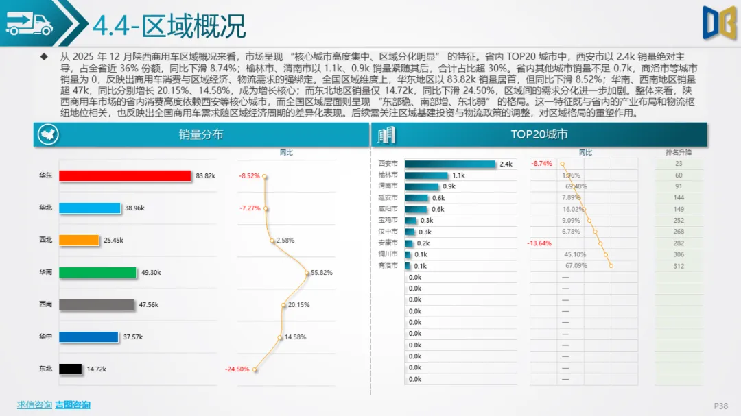 区域分布:销量高度集中于核心城市,西安市占全省超60%份额,一线城市销量占比38.87%,二线及以下城市同比普遍下滑,低线城市需求持续萎缩。
