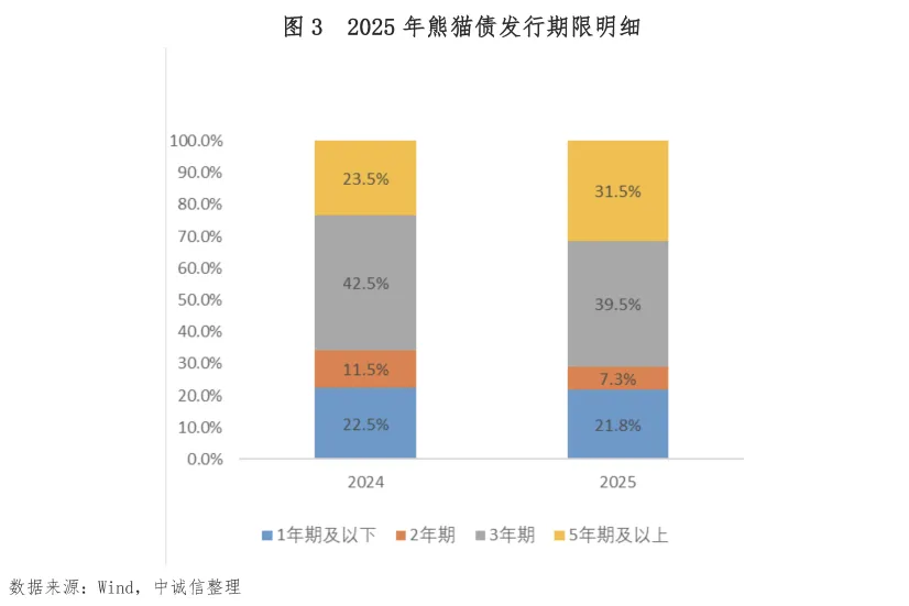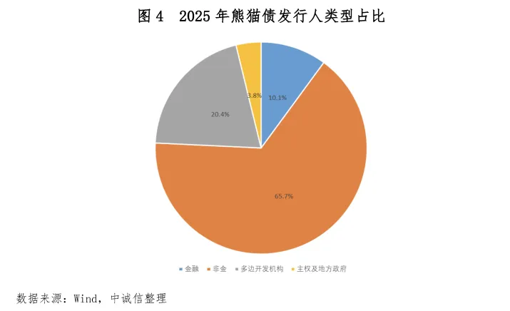 非金熊猫债发行人、多边机构发行人发行规模占比进一步提升。年内,非金、金融、多边开发机构、主权发行规模占比分别为65.7%、10.1%、20.4%、3.8%,其中非金占比较去年上行约8个百分点,多边机构上行约10个百分点,同时主权机构在2025年重返熊猫债市场。2025年国际金融市场不确定性依然存在,熊猫债市场作为日益成熟的在岸人民币资金池,为非金发行人提供了重要的多元化选择。